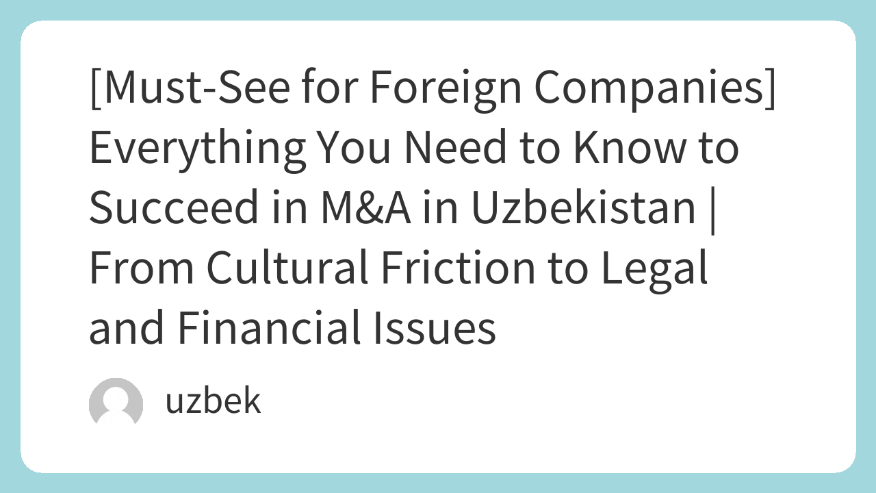 Hello. In recent years, Uzbekistan has been attracting a lot of attention as a growth market in Central Asia. With abundant natural resources and a young population, many foreign companies are considering entering the market through M&A.