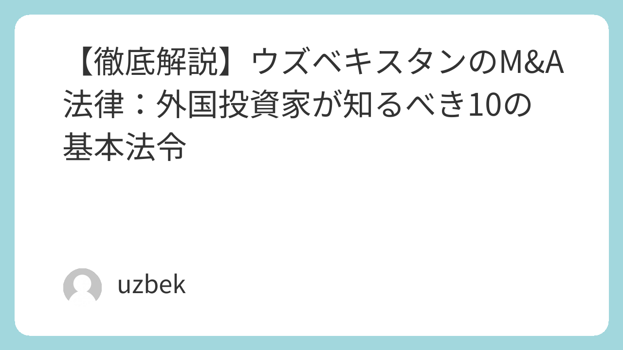 この記事では、ウズベキスタンの法令公式ポータル「lex.uz」を基に、M&Aに関連する最も重要な法律を10個抽出し、その内容をわかりやすく解説します。現地でのM&Aを検討する経営者、法務担当者、投資家の皆様の必携ガイドです。