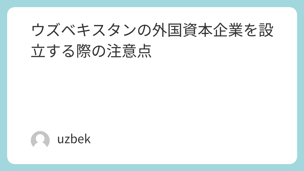 | 資本金の要件 | 外国企業とみなされるための最低資本金は4億スム(約3.4万ドル)。カラカルパクスタン共和国とホレズム州は2億スム。 | 外国投資法(共和国法第598号)など。 |