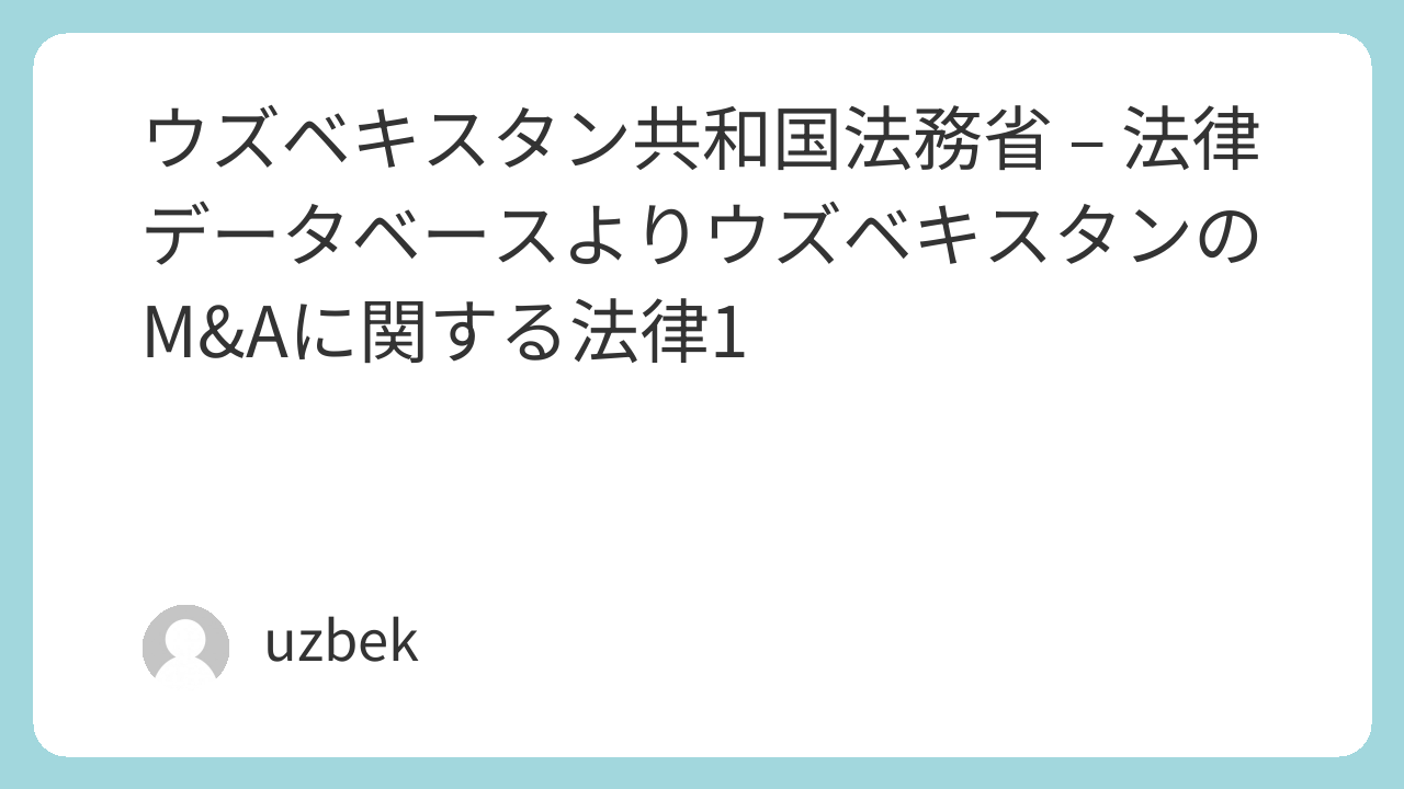 - 翻訳: ウズベキスタン共和国「競争に関する法律」 第5章 経済集中に対する国家管理第18条 競争制限機関との協議が必要な取引その他の行為 …個人または法人が… 事業体の事業活動の条件を決定することを可能にする権利を取得する場合…