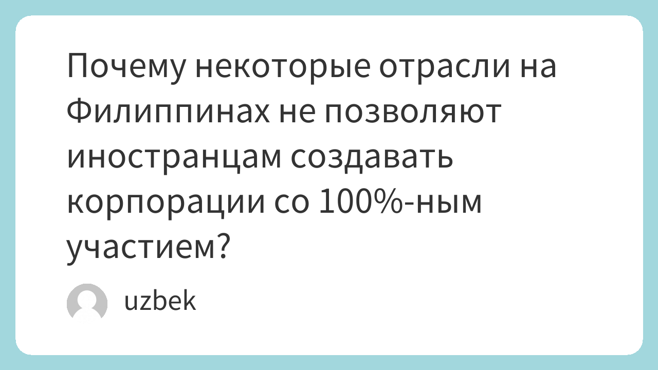 Причина, по которой в некоторых отраслях промышленности на Филиппинах иностранцам не разрешено создавать корпорации со стопроцентной собственностью, заключается в следующем: