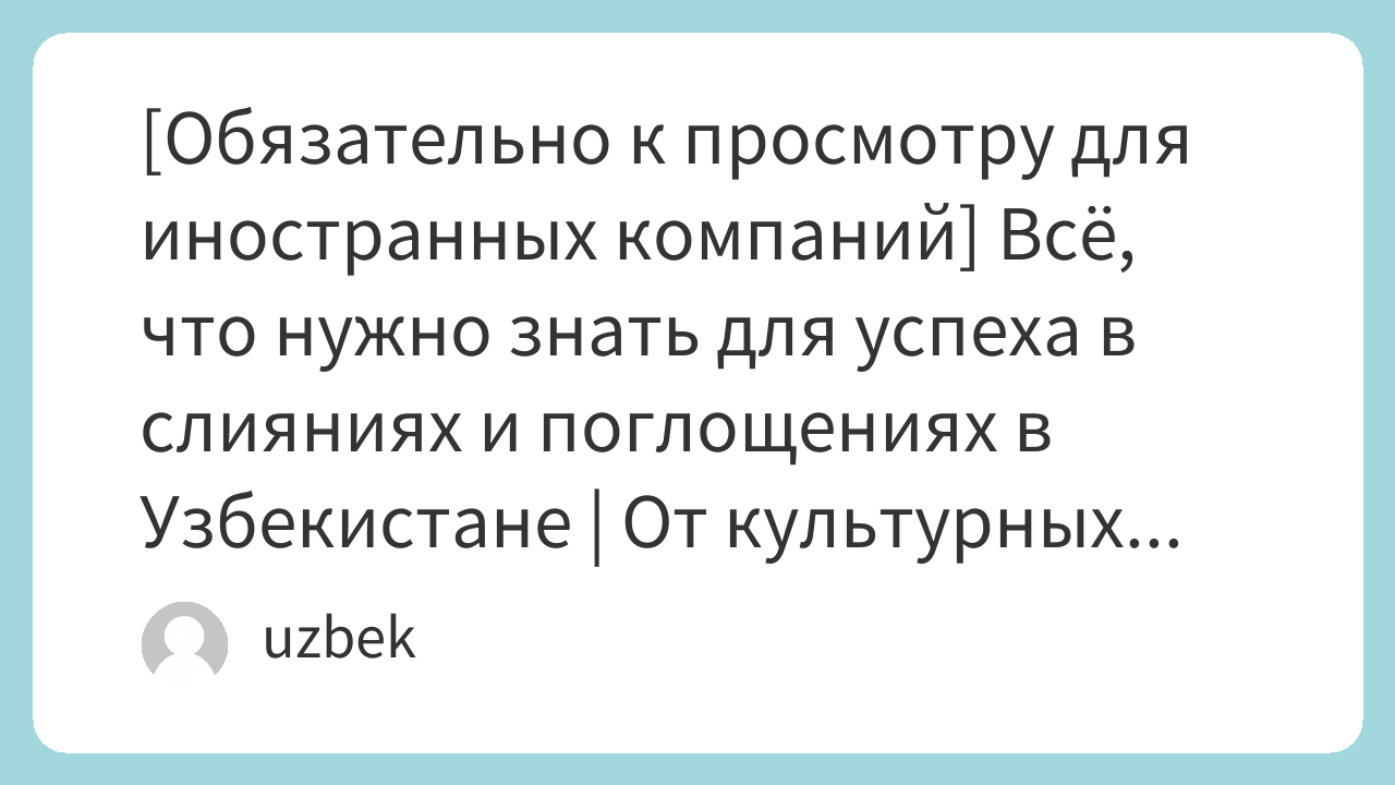 Мы также расскажем о моментах, которые следует учитывать при проведении сделок слияния и поглощения за рубежом в целом, а не только в Узбекистане.
