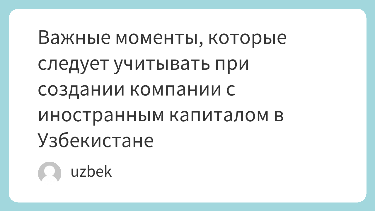 При создании и функционировании компании с иностранными инвестициями в Узбекистане следует учитывать несколько важных моментов. Ознакомьтесь с таблицей ниже, чтобы начать с основных моментов.