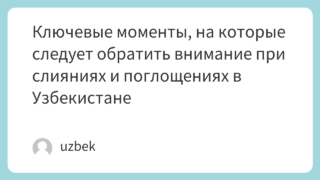 法令情報 Ключевые моменты, на которые следует обратить внимание при слияниях и поглощениях в Узбекистане 1. Правовая и нормативная среда Правительство Узбекистана активно поддерживает рост своего ИТ-сектора , создавая специал... 2025.09.19 法令情報
