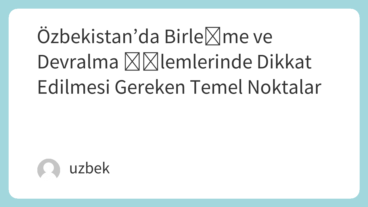 Özbekistan'da başarılı birleşme ve devralma işleminin anahtarı , yerel duruma aşina uzmanlardan (hukuk, muhasebe ve vergi) erken bir aşamada tavsiye almak , kapsamlı bir durum tespiti yapmak ve her şeyden önce yerel kültürü ve iş uygulamalarını anlamak ve güven ilişkileri kurmaya çalışmaktır .