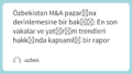 Özbekistan , güçlü devlet desteği ve zengin genç yetenek havuzu sayesinde, özellikle BT sektöründe oldukça cazip bir birleşme ve satın alma pazarı olarak hızla büyüyor. Ancak, olgunlaşmamış hukuk sistemi, finans sektörünün durumu ve çevresel sorunlar gibi riskler de mevcut.