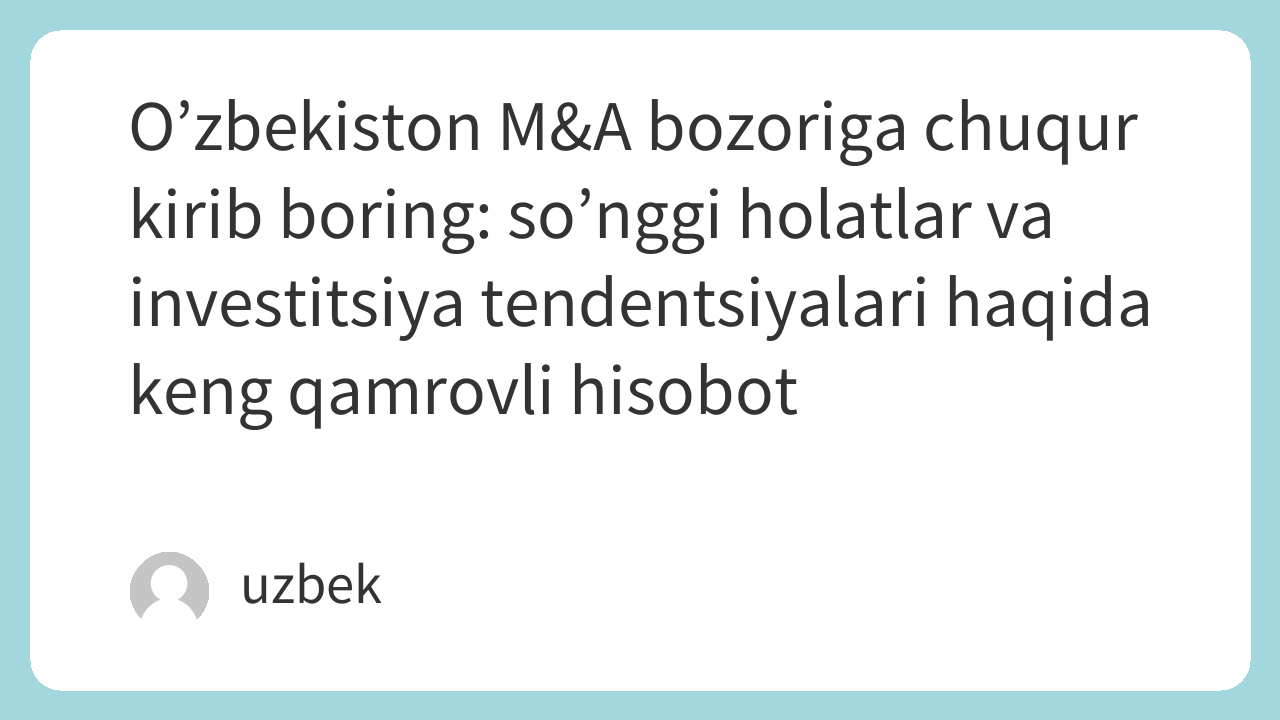 O‘zbekistonning M&A bozori so‘nggi yillarda hukumatning faol iqtisodiy islohotlari va investitsiyalarni rag‘batlantirish siyosati tufayli tez o‘zgardi. Ushbu hisobotda O‘zbekistonda M&A faoliyatining hozirgi holati, asosiy misollar va kelajak istiqbollari har tomonlama tahlil qilingan.